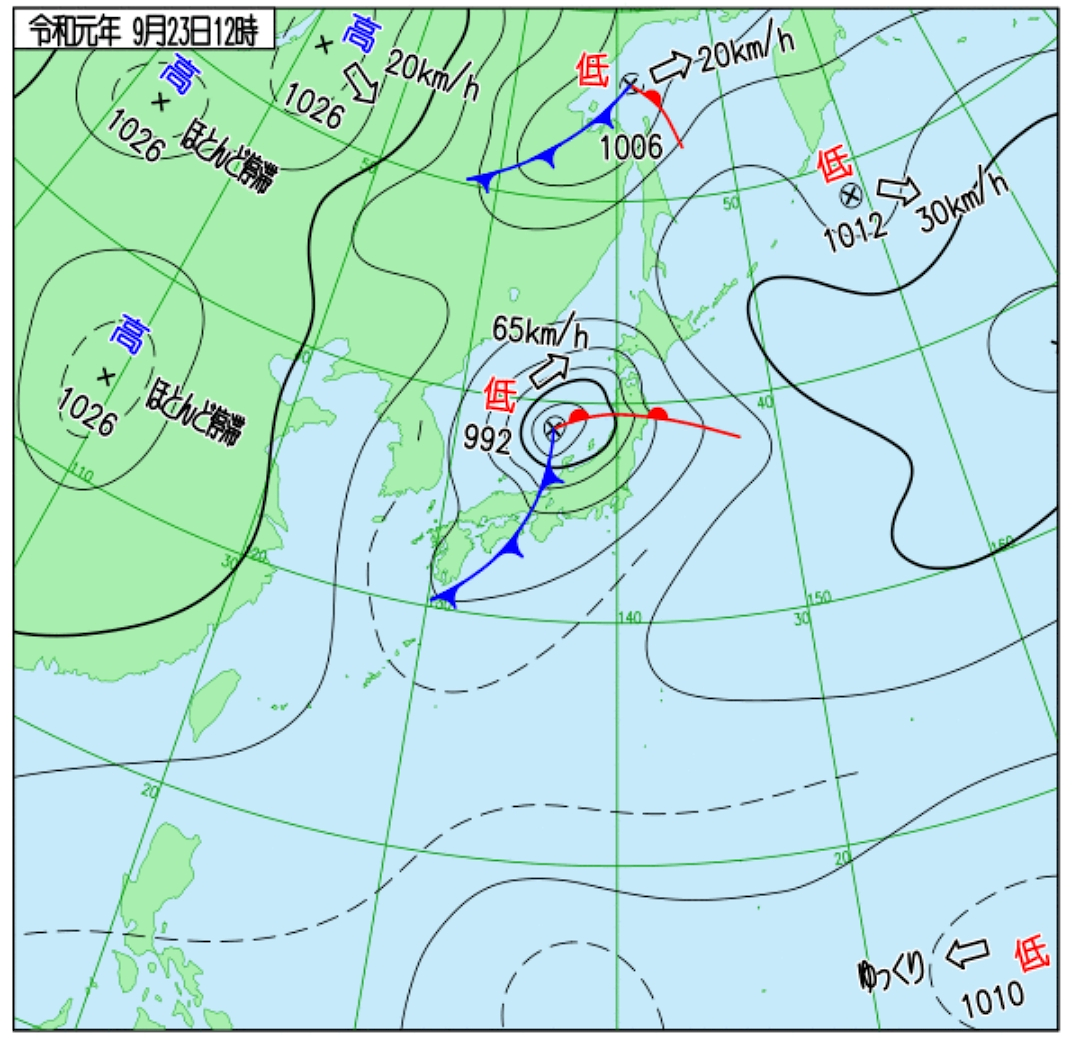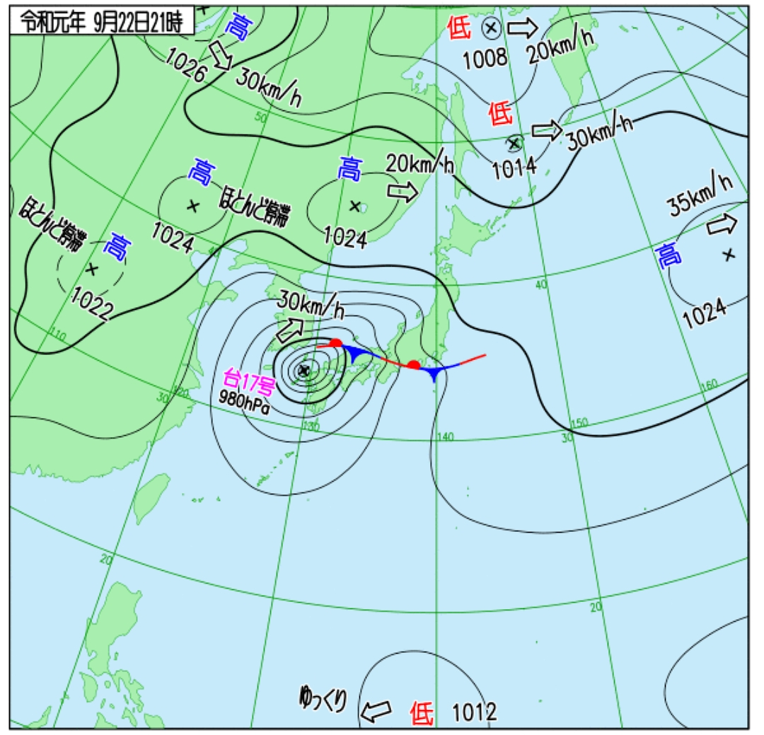 台風17号(ターファー) 雑記 2019.09.23 (2019.09.23 09:00時点/台風は温帯低気圧に) 今年の台風は多いとは言えないけど、被害はかなり多いです。 台風17号は大型で日本全土に影響を及ぼし、台風15号のときにライフラインを絶たれた千葉県も、いったんは復旧したところも今回の強風の影響で再び停電になったり応急処置的に屋根に被せたビニールシートが使い物にならなくなったり。 (2019.09.22 21:00時点) (2019.09.23 12:00時点) そういえば、我が家も台風15号で固定していた屋外の光ケーブルが外れるといったちょっとした被害がありました。来月にでも直してもらわなくちゃ。