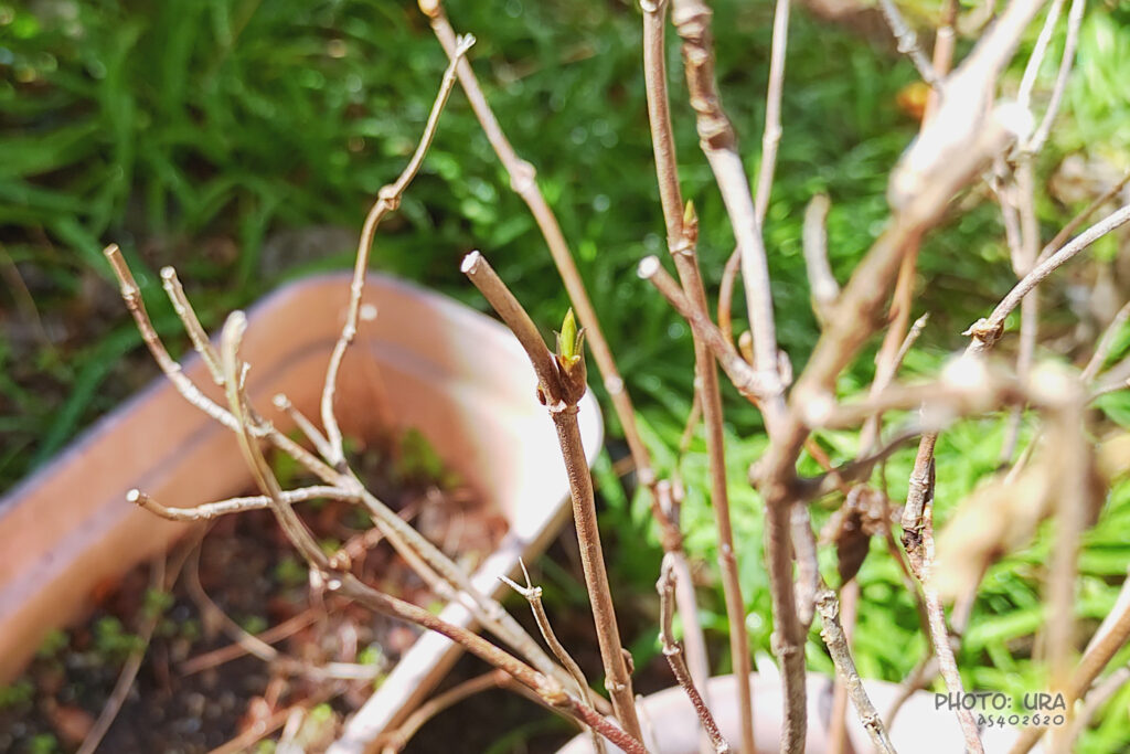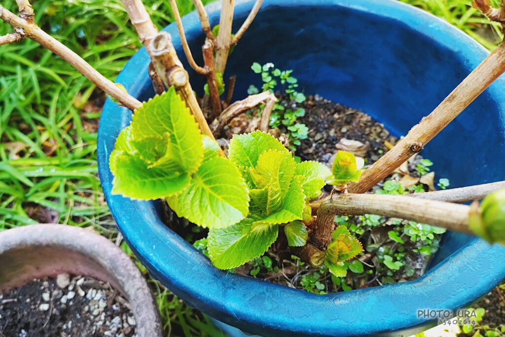 最後の写真は、長野に出かけたときにいただいた苗を育てているヤマアジサイ。芽が小さくて、毎年剪定するのが難しくてほぼそのままにしちゃっています。冬が来るたびに《冬を越せるのか?》と思っていますが、芽吹いたときはホッと胸を撫で下ろします。今年も無事に芽吹きました。大きめだった植木鉢もだいぶ狭くなってきたので、シーズンが過ぎたら植木鉢をさらに大きくしてあげようと思います。