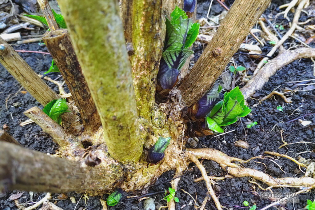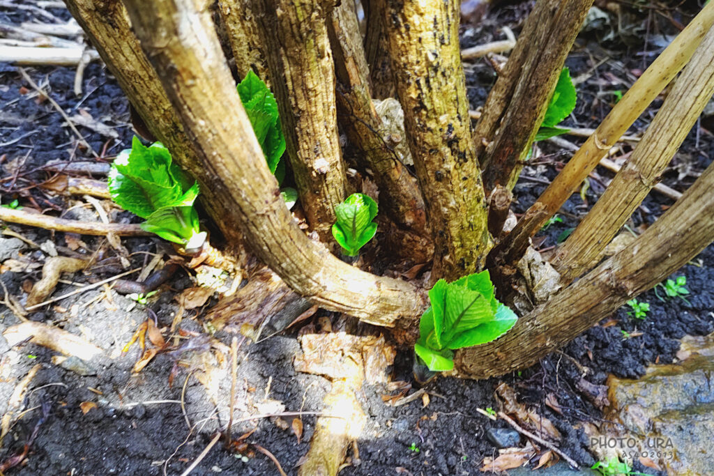 ガクアジサイといえば、我が家では2つの地植えのものがあります。かなり育っているので、背を越えるところで咲くときもあります。昨年はだいぶ剪定をしてスッキリさせました(さすがに強剪定は怖くてできない…)。そのほとんどの枝で芽吹きましたが、地面に近いところからも多くの芽が出てきたのを見つけ、嬉しかったです。