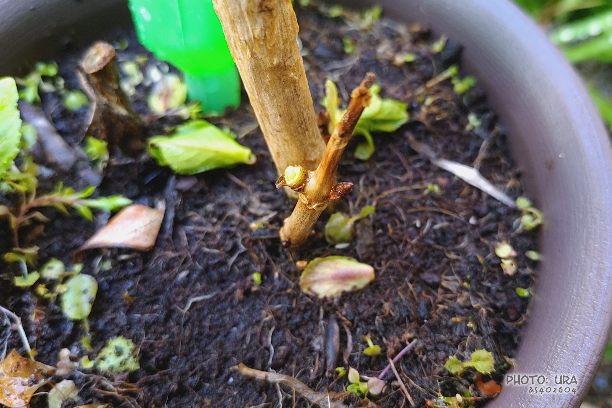 雪が降った翌々日。改めてガクアジサイの植木鉢を見てみました。